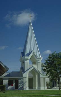 St. Mark's Episcopal Church is located on Marco Island, a barrier-island which is rapidly developing into a suburban resort community. The congregation was established 30 years ago and is seasonal, conservative, and very traditional. The Church is trying to establish a more visible presence in the community, as the congregation was not growing, partially due to limited and worn-out facilities. Phase 1 of the building program began with a new Master Plan, then construction of a Parish Hall Building and new parking areas. Phase 2 required the complete reconstruction of the existing Church Building. The Master Plan that identified and solved many significant problems built into the existing site and its facilities. Before considering liturgical requirements, these and many other basic design problems had to be solved. The solution had to include a clearly identified and convenient entrance to the Church, correction of the parking and flooding problems, a new Parish Hall, and if possible, an element that would restore a "landmark status" to the Church. The design solution uses a curved driveway along the North side of the site to better distribute the parking areas, while preserving the familiar and appreciated front lawn. The new Bell Tower serves both as a landmark to all passing by, and as the new entrance to both the Church and Parish Hall. The new entrance is located at a midpoint in the reconfigured parking lot, convenient to both parking areas and linking the Church building to the Learning Center and to the Courtyard garden. St. Mark's Church is designed to reflect the main requirement of the Catch the Spirit Campaign- a complete transformation was needed while renewing the Church. The design solution did not, however, remove the original structure. The exterior elevations of the reconstructed Church were designed to work with, rather than against, the unusual roofline and proportions of the existing building, resulting in a design that extends the roofline in a similar manner without attempting to match the height of the ridge. The Altar addition is slightly lower than the original Nave, clearly providing a visually layered design that expresses the function of the spaces within. The main entrance to the old Church faced North, directly towards a busy, pedestrian-unfriendly thoroughfare, away from the parking lot, with a very long sidewalk around the side of the building. The existing grade required steps at the main entrance, making the front door of the Church difficult for many elderly members and completely inaccessible to the disabled. These problems were solved with the new Master Plan and reconstruction. Inside, the original building had many fundamental problems, including structural damages caused by Hurricane Andrew, and subsequent leaks. The layout of the building was crowded, acoustics were poor, and the existing lighting was inadequate. To use the restrooms during service, parishioners had a choice of 1.) walking past the pulpit and behind the altar table, 2.) walking through the pastors office, or 3.) leaving the building. The new plan solved all of these problems, and more. You can use the links below to find additional narrative descriptions and many more photographs of St. Mark's.